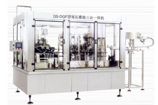 等壓灌裝機(DS-DGF)系列設備用干聚脂瓶裝各種碳酸飲料的生產。在一機上實璐沖瓶、灌裝、封蓋。整機沒計科學合理,外形美觀,功能齊全,操作維修方便,自化程度高。 綜合采用意大利、德國先進技米。灌裝速度快,液面控制穩。如:無瓶時不灌裝,沖氣或灌裝時爆瓶則灌裝閥將自動關閉,并有自動沖洗等先進自控技術。 采用托瓶提升氣缸,油尼龍齒輪轉動,噪聲小,整機運轉平穩。 采用磁力扭矩式擰蓋頭,實現抓蓋、擰蓋功能。擰蓋力矩無級可調,具有恒力矩旋封塑蓋功能,且不傷蓋,封口嚴密可靠。 水平回轉式氣力理蓋器.具有不損壞瓶蓋表面,料斗內缺蓋發信號自動補充蓋等功能。 整機采用幾PLC電腦程序控制及人機界面觸摸屏按鈕,具有料缸內液面自動控制,無瓶不罐裝,無瓶不加蓋等功能,并有撥瓶星輪卡瓶錯位停機蓋滑槽內缺蓋停機等功能。